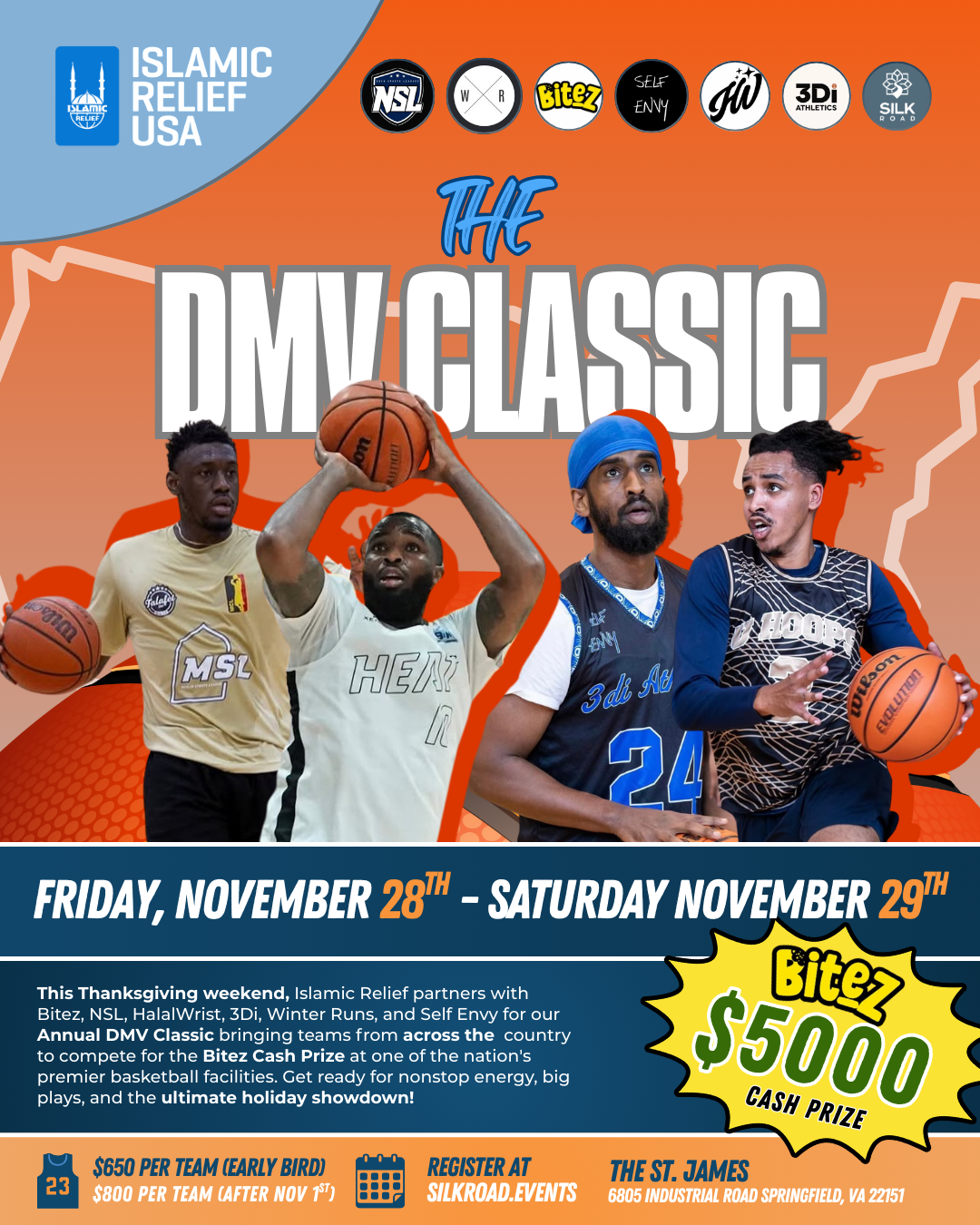 This Thanksgiving weekend, Islamic Relief partners with Bitez, NSL, HalalWrist, 3Di, Winter Runs, and Self Envy for our Annual DMV Classic bringing teams from across the country to compete for the Bitez Cash Prize at one of the nation's premier basketball facilities. Get ready for nonstop energy, big plays, and the ultimate holiday showdown!